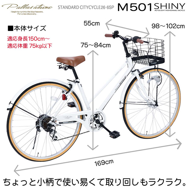 Xe đạp nữ Nhật Bản Mypallas M501 phiên bản đèn LED tự động, cùng với hệ thống phát điện trực tiếp tại may ơ, thiết kế kiểu dáng khung nhẹ nhàng, xe được sử dụng bộ chuyển số Shimano 6 speeds, với cỡ vành nhôm 26'.
